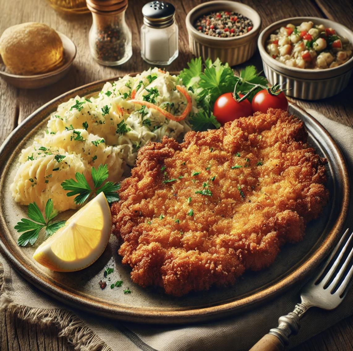 paniertem Hühnerfleisch, Salat, Tomaten, Zwiebel, Dressing, Pizzastangerl